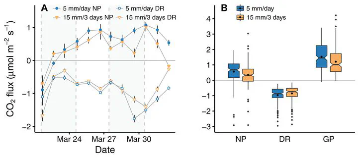 We experimentally assessed the carbon exchange of a biocrust community dominated by the lichen Diploschistes diacapsis in central Spain. We compared the effect of two simulated precipitation patterns providing the same overall amount of water, but with different pulse sizes and frequency (high frequency: five mm/day vs. low frequency: 15 mm/3 days), on net/gross photosynthesis and dark respiration.