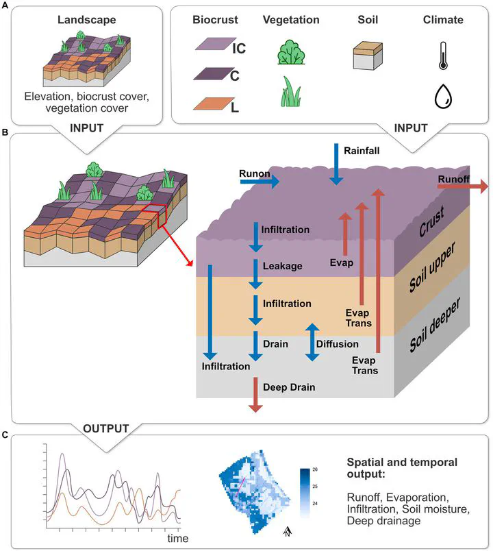 Overview of the extended EcoHyD model with biocrust layer. (A) Required model input: spatial maps of elevation, biocrust and vegetation cover, as well as parameters for biocrusts (IC, incipient cyanobacteria; C, cyanobacteria; L, lichen), vegetation (shrubs and annual herbaceous vegetation), soil and climate (temperature and rainfall). (B) Model processes in one grid cell for the 3 layers. Blue arrows show the processes that provide water input into a cell, red arrows show water output. (C) Model output that is analyzed in this study: temporal output of different processes for each of the biocrust cover types and spatial output for each grid cell.Abstract